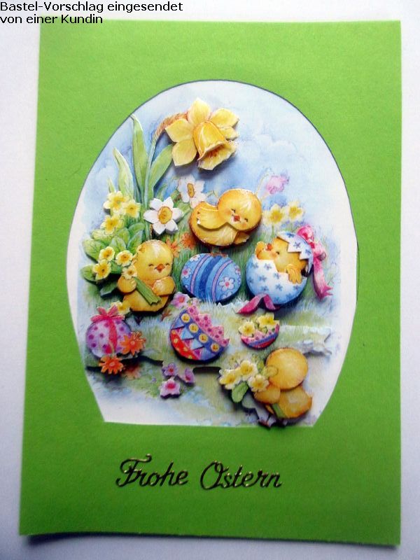 Die Bastlerin hat sich hier besonders viel Mühe gemacht und ein eigenes Passepartout in die Karte geschnitten. Dieses Passepartout ähnelt in der Form ein bisschen einem Osterei, was für eine Osterkarte natürlich sehr passend ist.